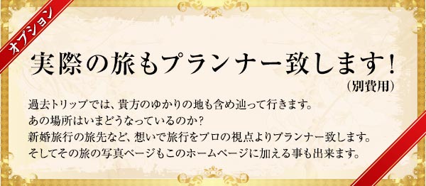 過去トリップではお一人様でもご夫婦様でも旅に出かけられます。 サンプルのイメージがスタンダードプランとなります。
